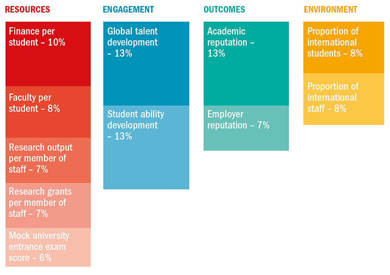The Japan rankings are built around four pillars that demonstrate the broad strength of an institution