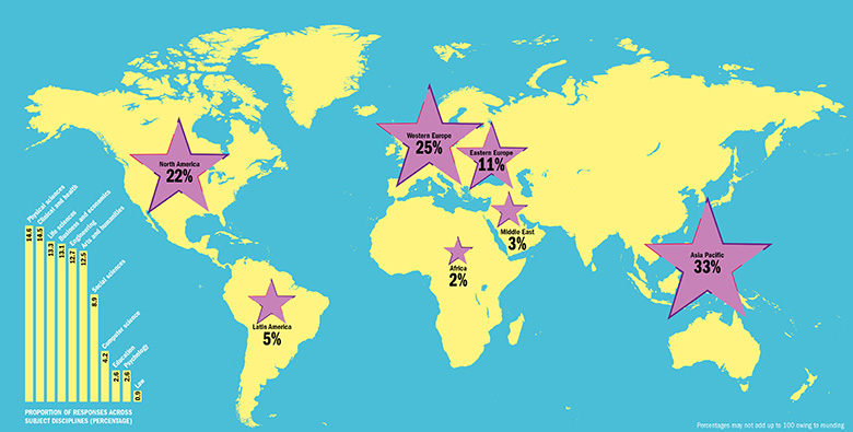 We have worked hard to ensure a balanced spread of responses across the disciplines. The best represented subject was physical sciences (accounting for 14.6 per cent of responses), followed closely by clinical and health (14.5 per cent). Also well represented were life sciences (13.3 per cent of responses), business and economics (13.1 per cent), engineering (12.7 per cent) and arts and humanities (12.5 per cent). The rest of the responses came from social sciences (8.9 per cent), computer science (4.2 per cent), education (2.6 per cent), psychology (2.6 per cent) and law (0.9 per cent).