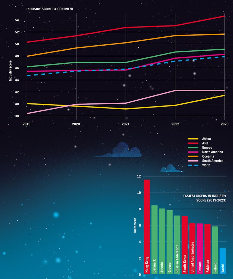 Perhaps unsurprisingly, the place that has improved the most in working with industry over the past five years is Hong Kong, where the average score rose from 53 to 64. The second largest increase was in Denmark, which rose from 52 to 60.