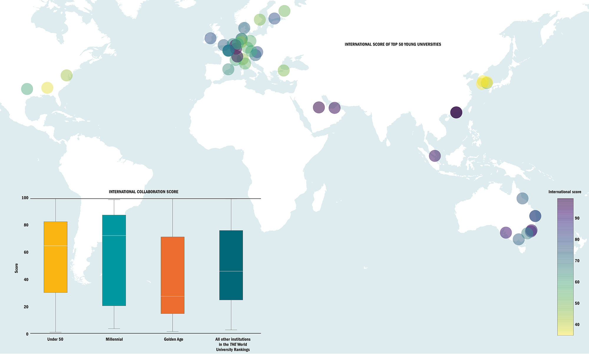 The importance of national location to a university’s internationalisation efforts is further emphasised by the map, which shows scores in the international outlook pillar (a combination of metrics on shares of international staff, students and cross-border collaboration) for the top 50 institutions in the Young University Rankings.